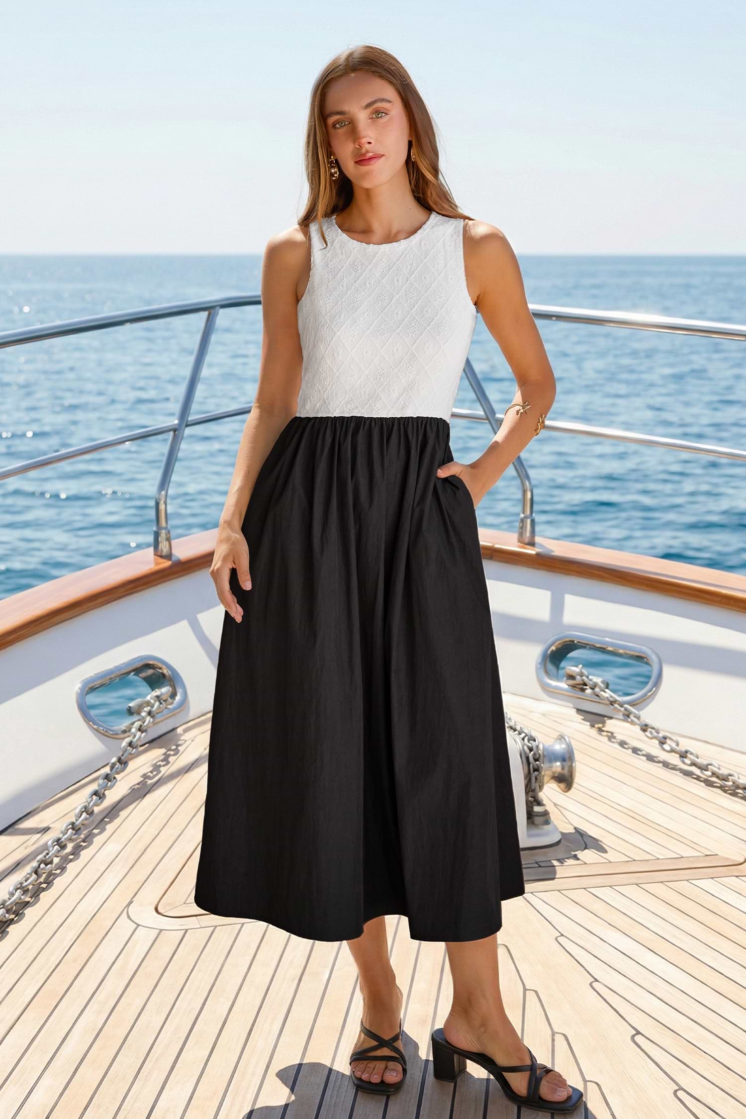 The Showbiz Two-Toned Midi Dress brings effortless, modern energy! The round neckline and sleeveless cut keep it sleek and polished, while the midi length adds a touch of elegance.