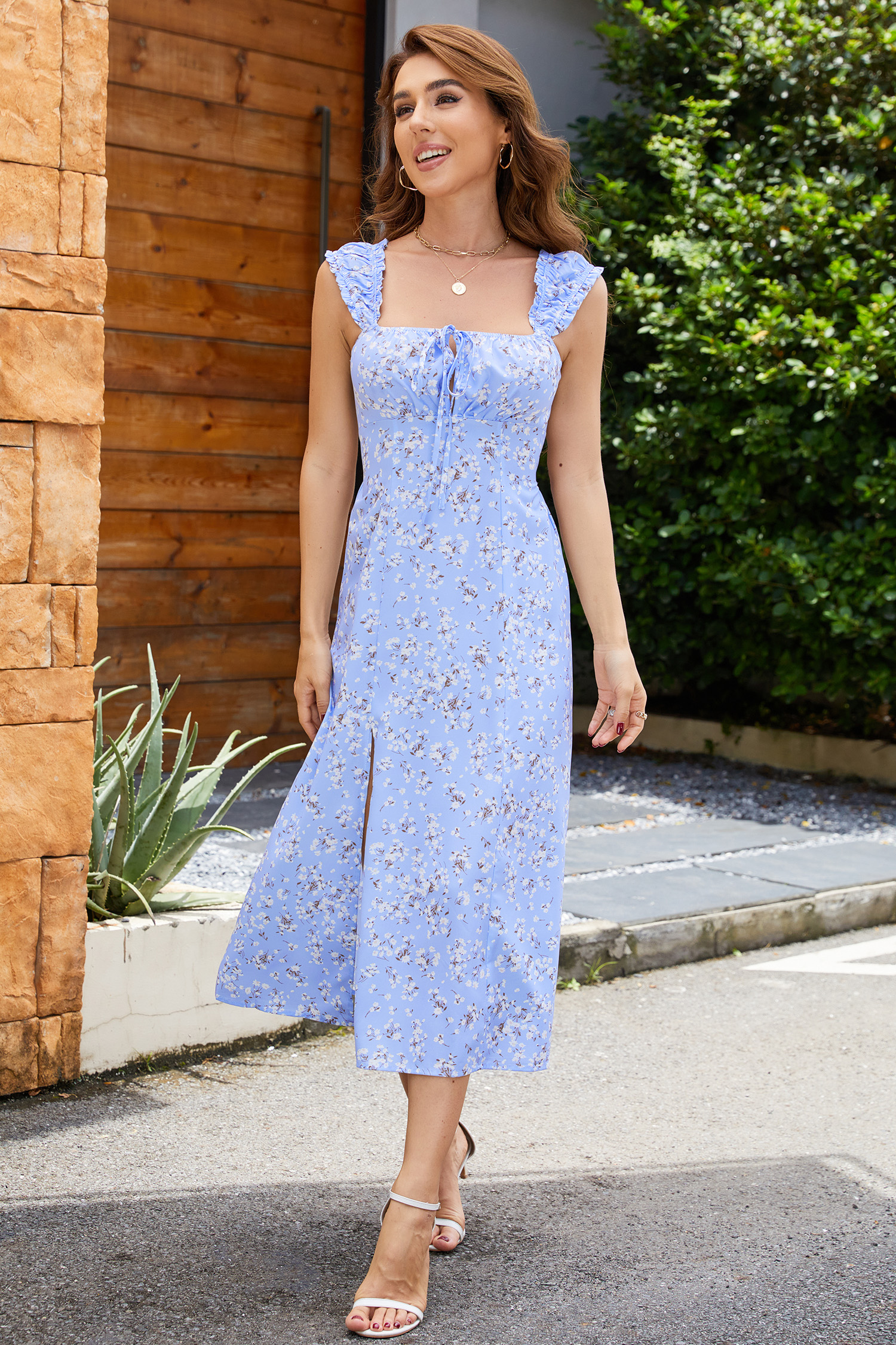 HomeSky Blue Ditsy Floral Sleeveless Square Neck Midi Dress