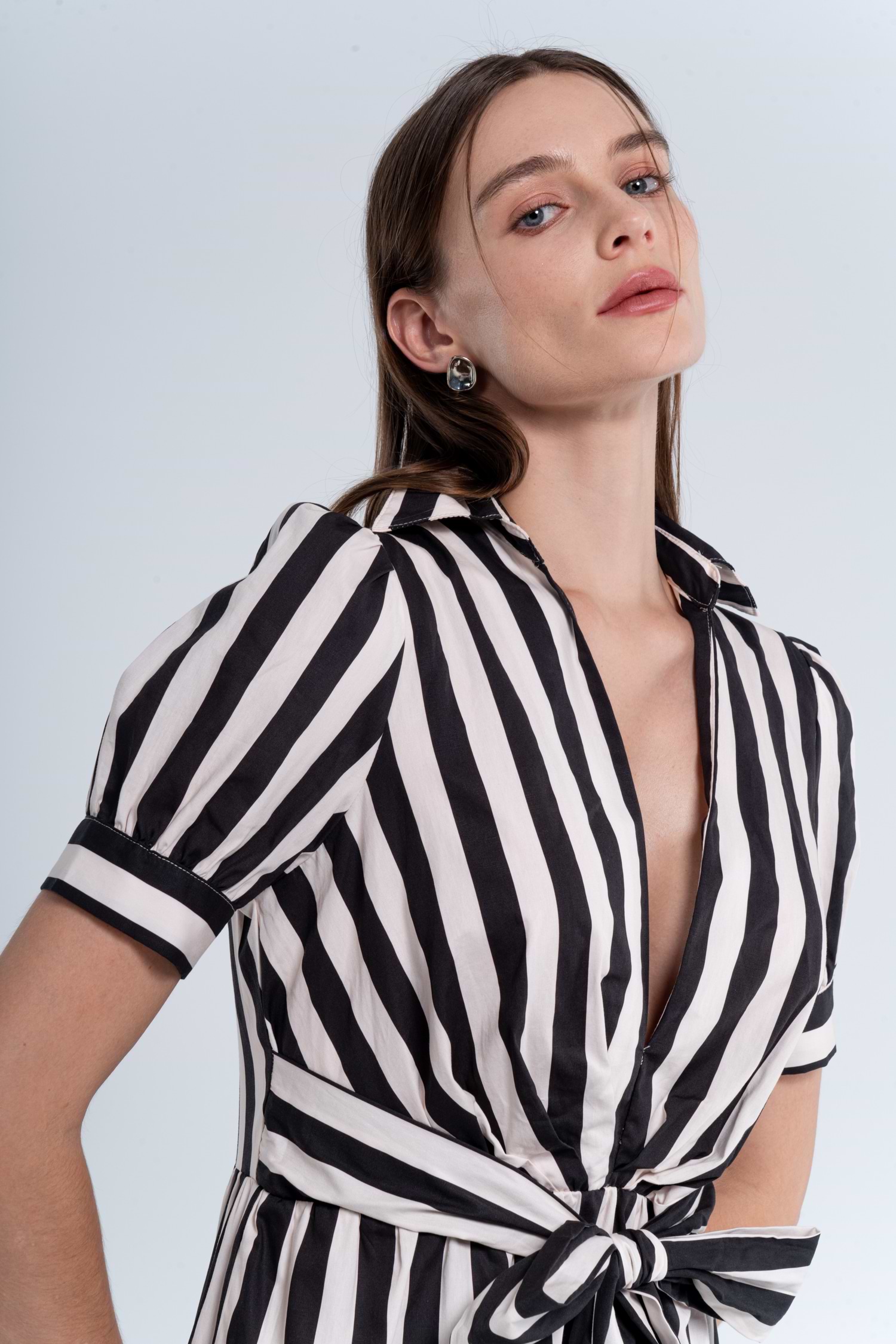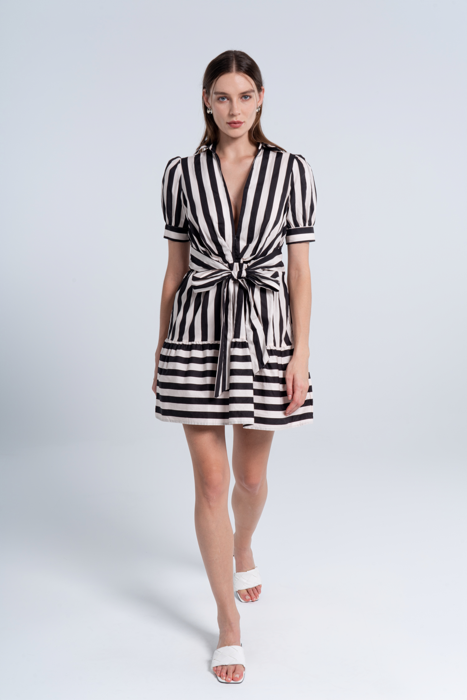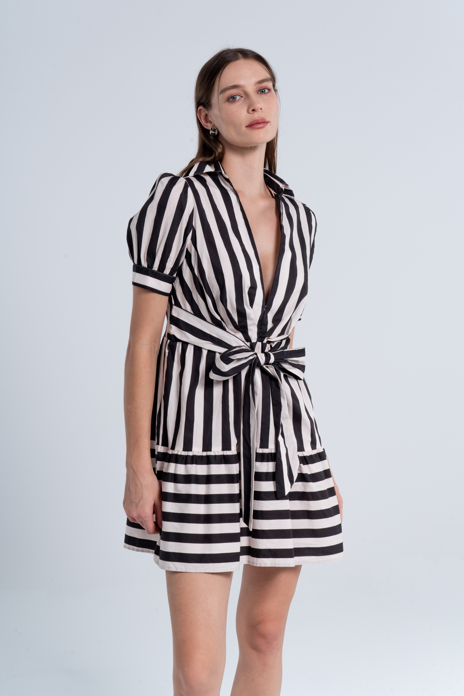 The Striped Plunging Collared Puff Sleeve Mini Dress is a bold choice. It features a plunging neckline, puff sleeves, and an eye-catching oversized bow at the waist, making it perfect for making a statement at any event.