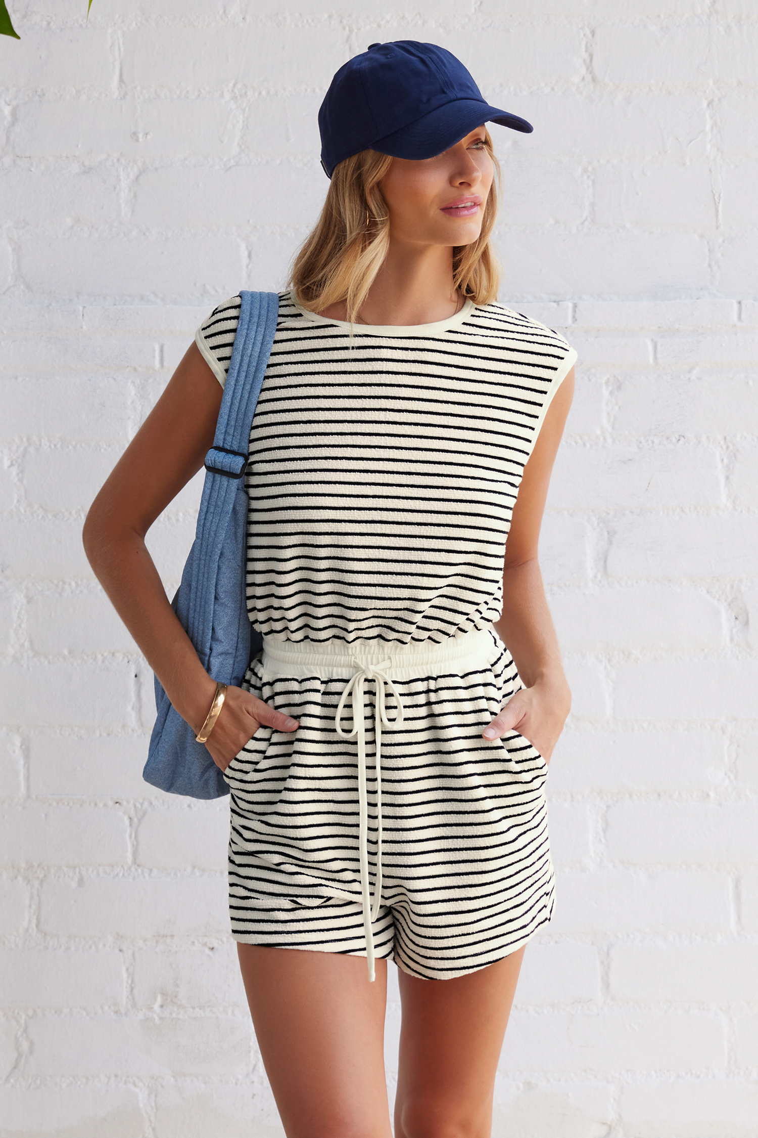 HomeStriped Round Neck Cap Sleeve Wide Leg Romper