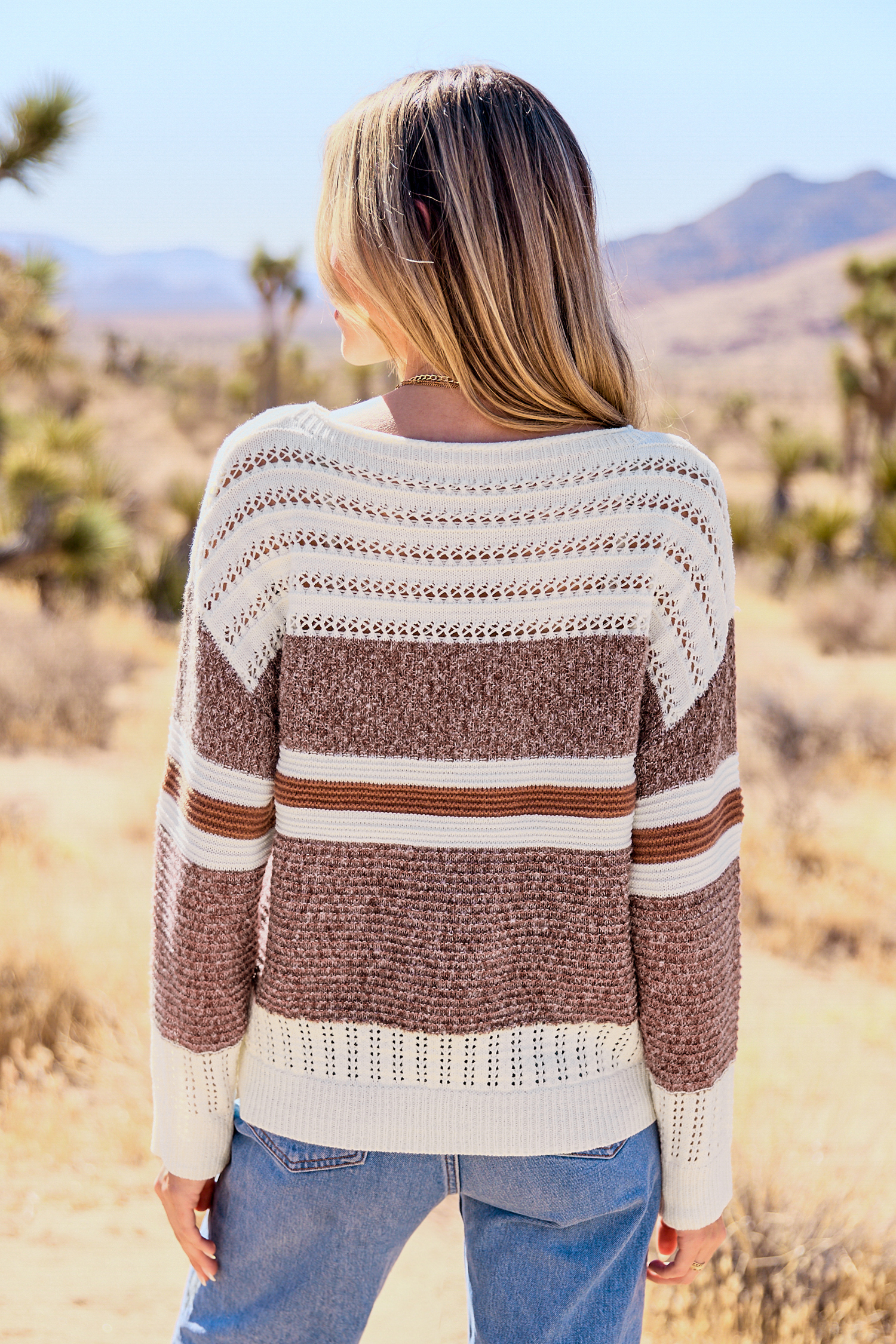 HomeStriped Round Neck Cut-Out Knit Sweater