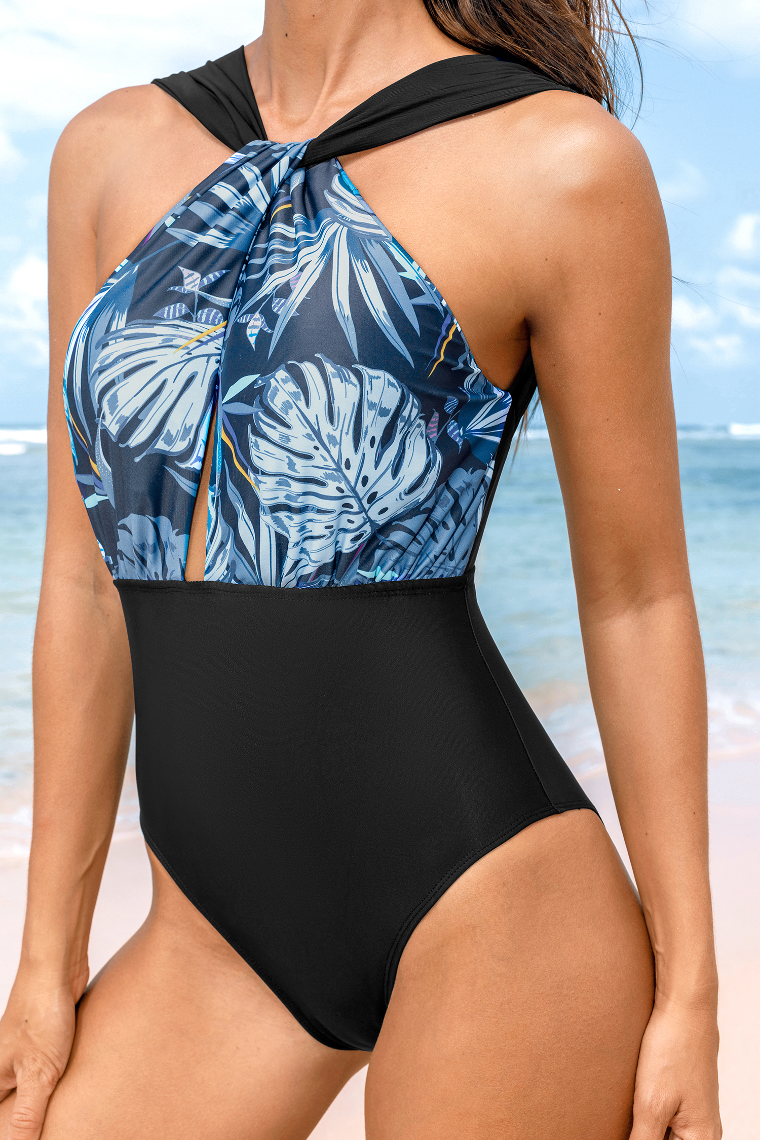 Tropical Leaf Print Cutout One Piece Swimsuit