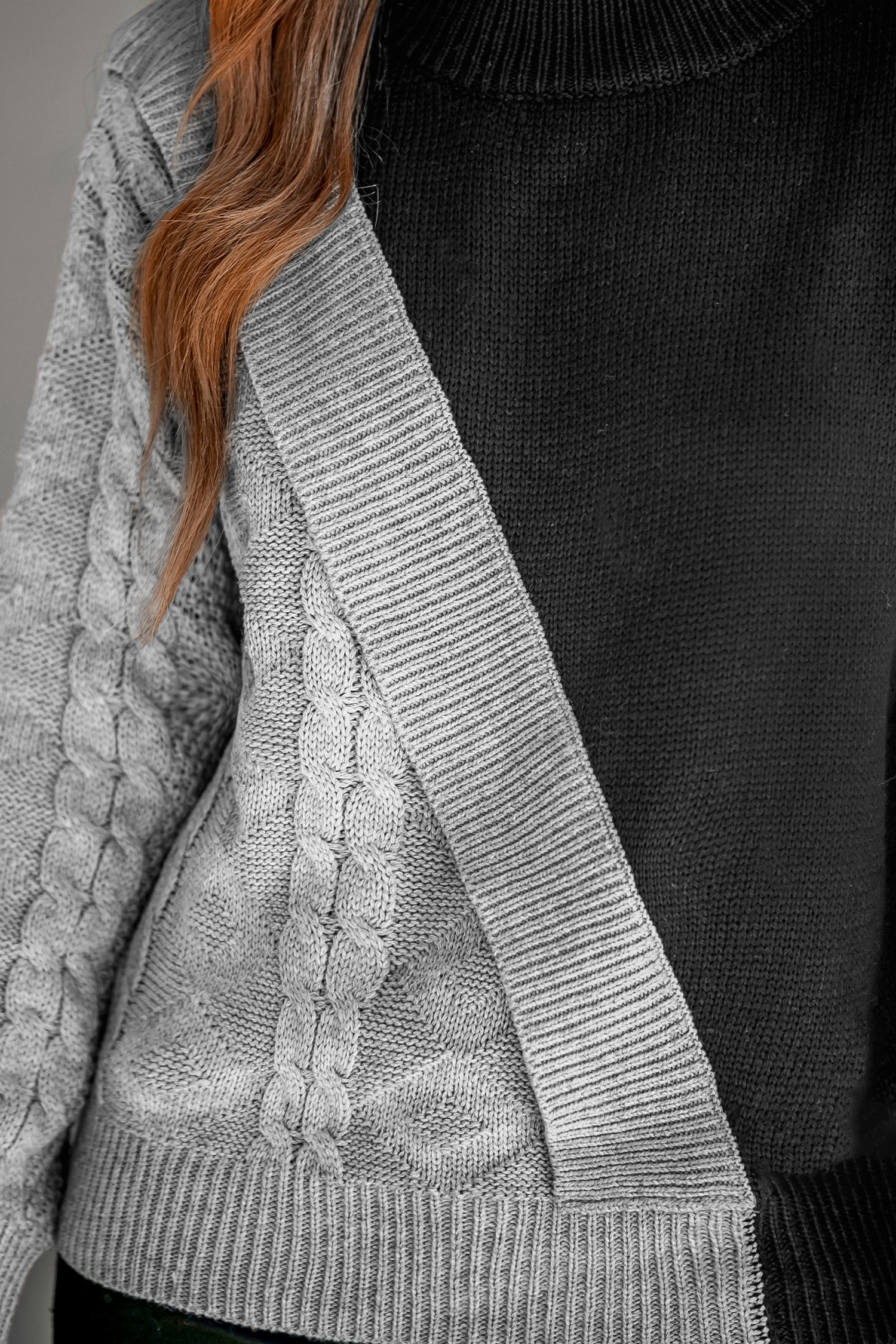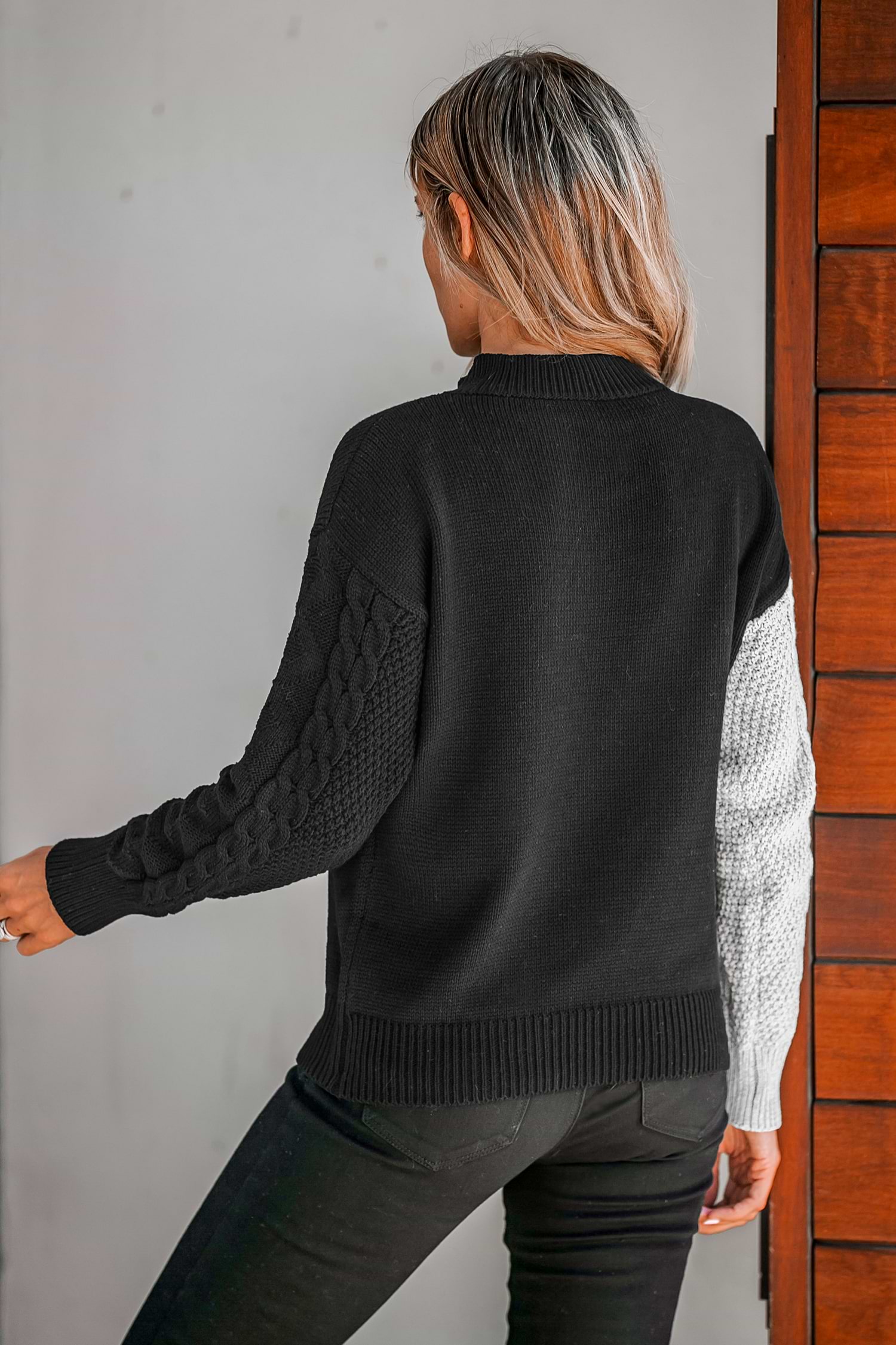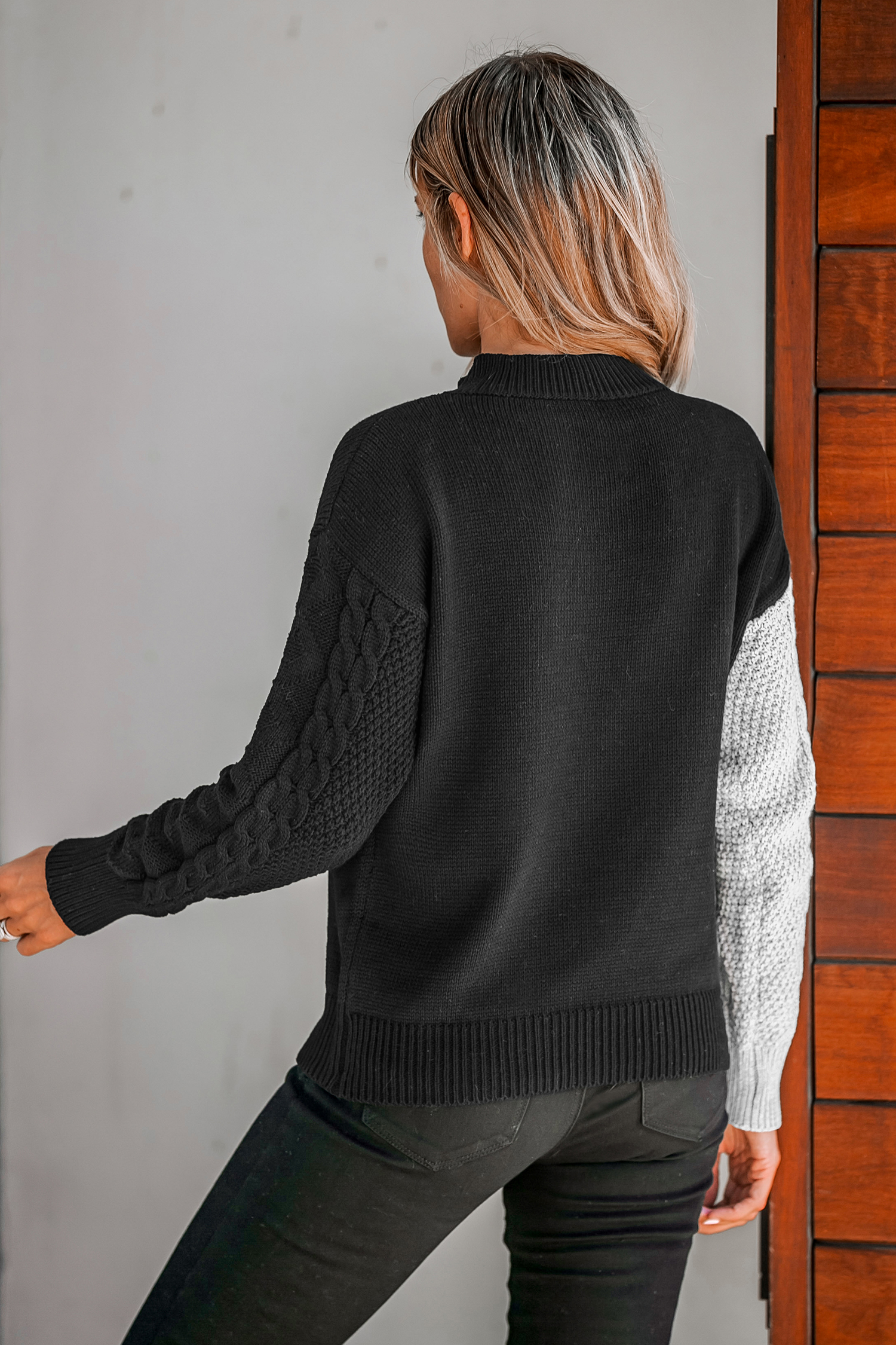 Two-Tone Cable Knit Mock Neck Sweater