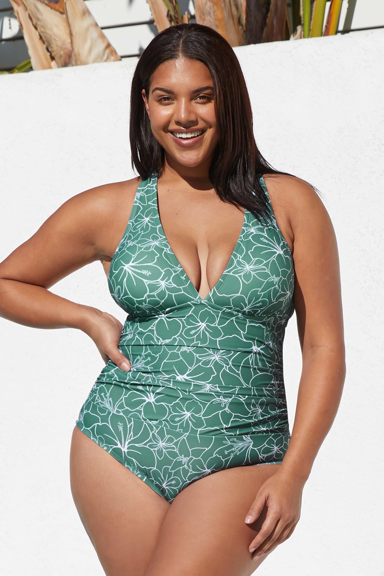 Vines of Lines Shirred Tie Back Plus Size One Piece Swimsuit