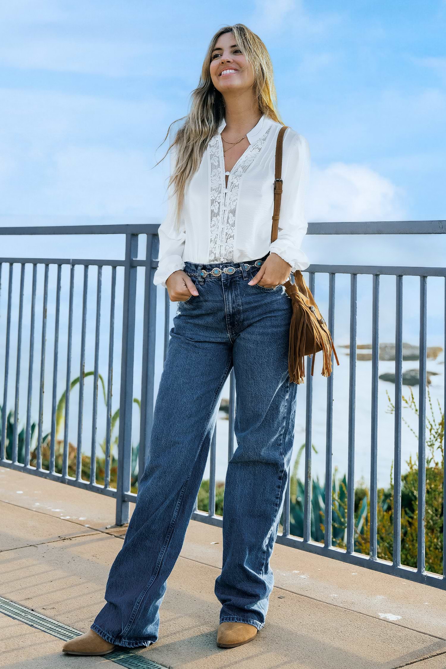 HomeWhite Lacey Notched Neck Long Sleeve Blouse