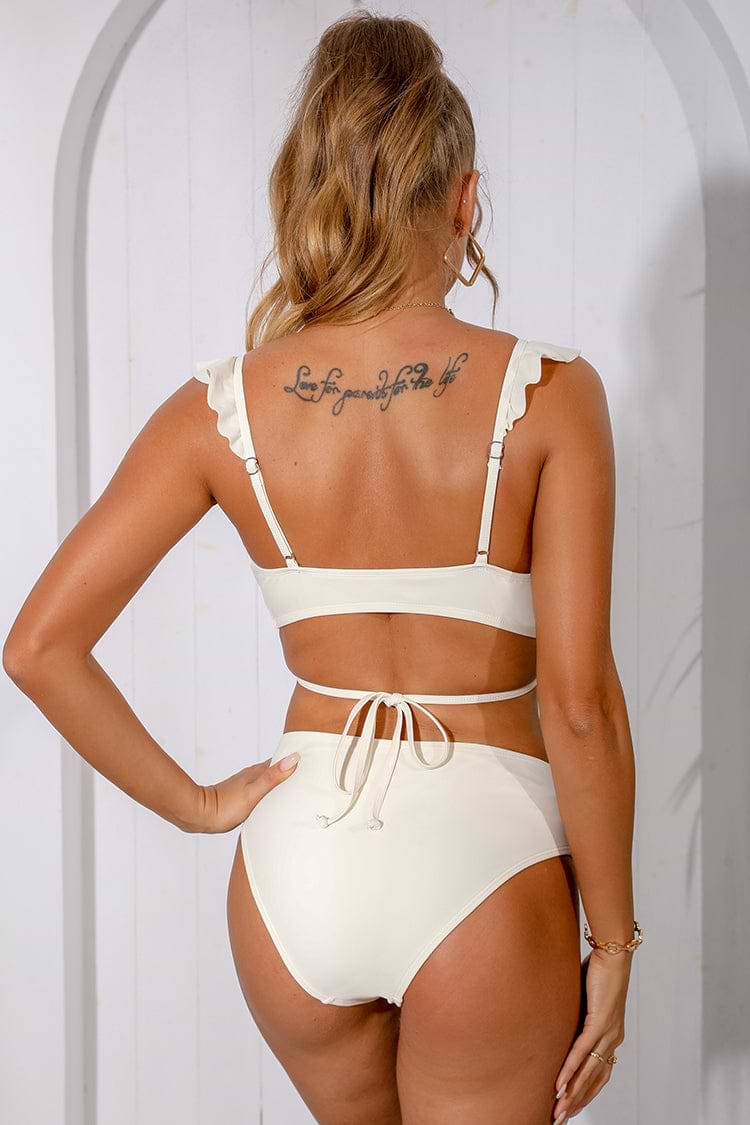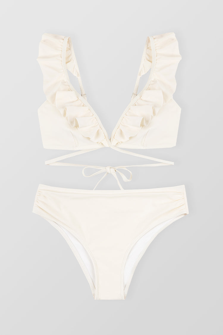 Cream Ruffle Wrap Side Shirred Mid Rise Bikini Set
