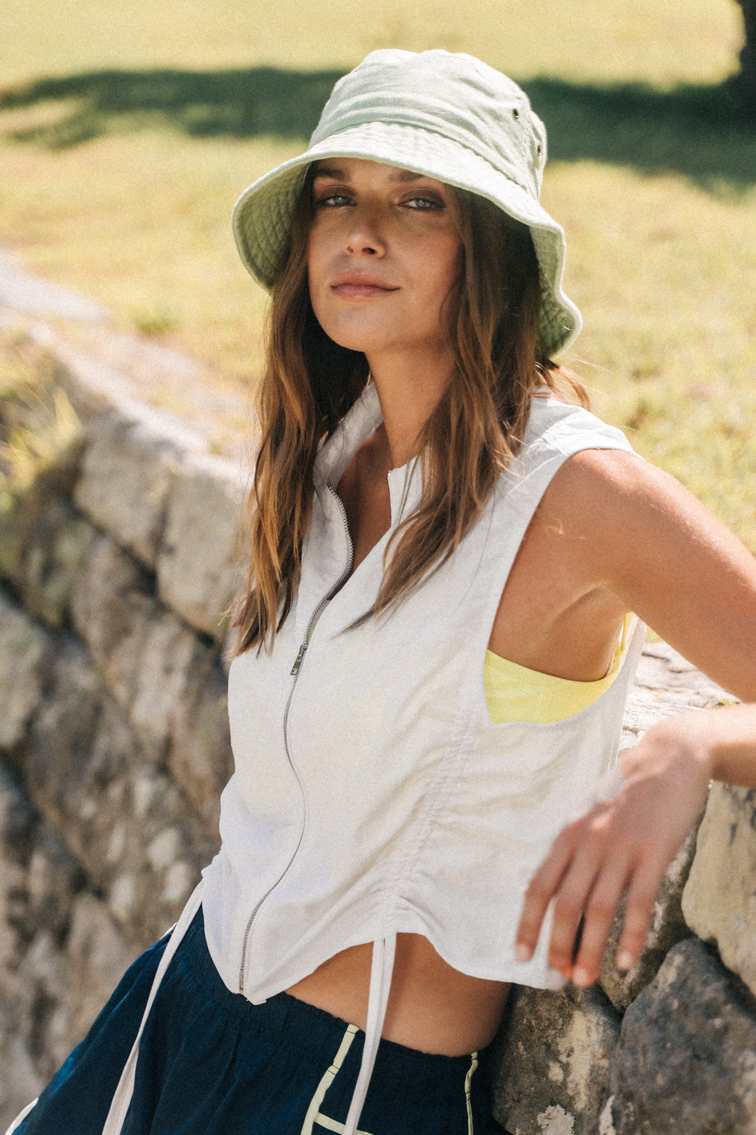 White Sleeveless Standing Collar Zip-Up Top