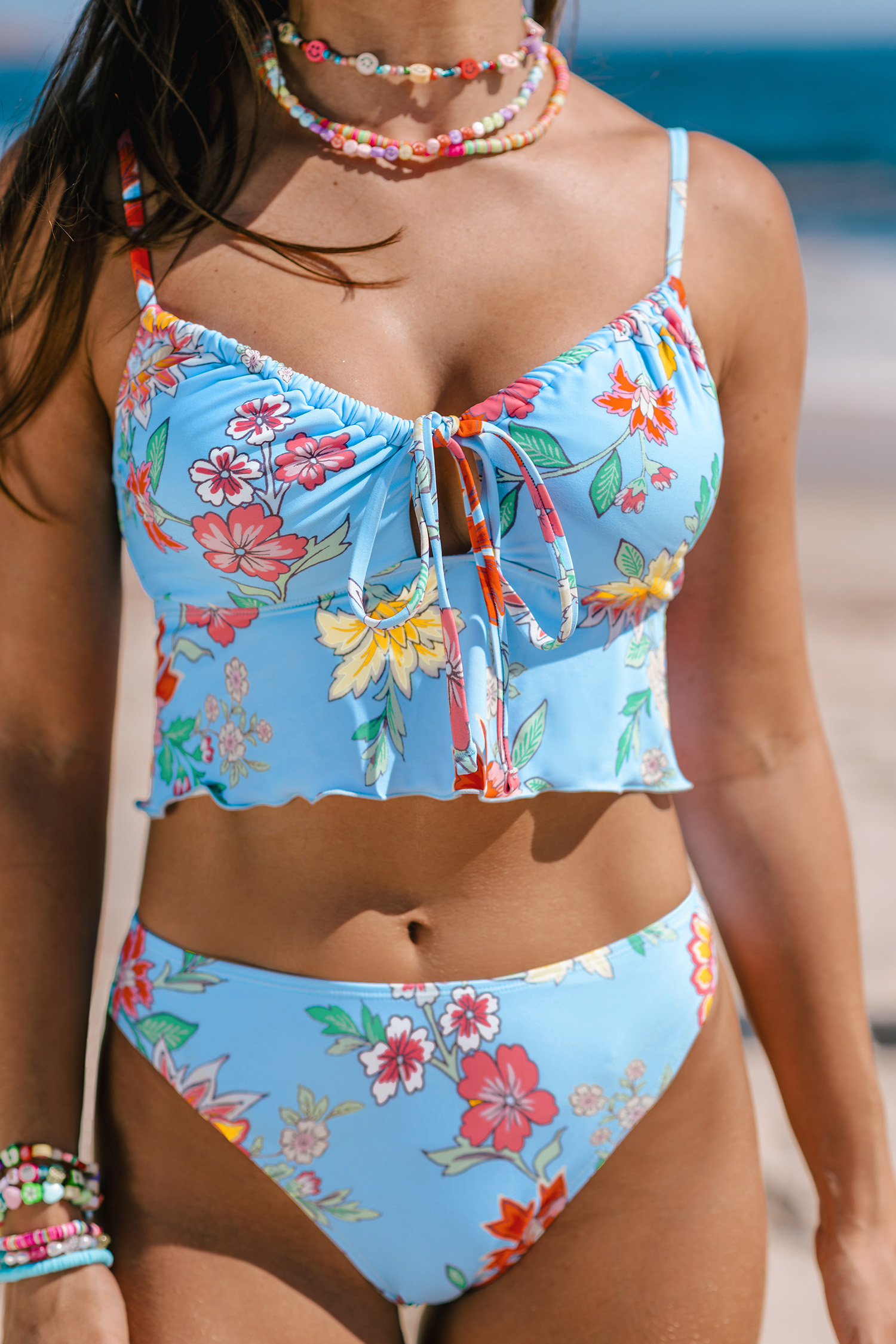 The Wildflower Front-Tie Cami Bikini Top & Mid-Rise Bottoms Set blends playful design with a flattering fit. The diamond neckline and adjustable straps ensure a comfortable, supportive fit, and the removable soft cups offer medium bust support. The lettuce hem adds an element of fun, while the mid-rise waist, modern high leg cut, and cheeky bum coverage make for a contemporary fit.